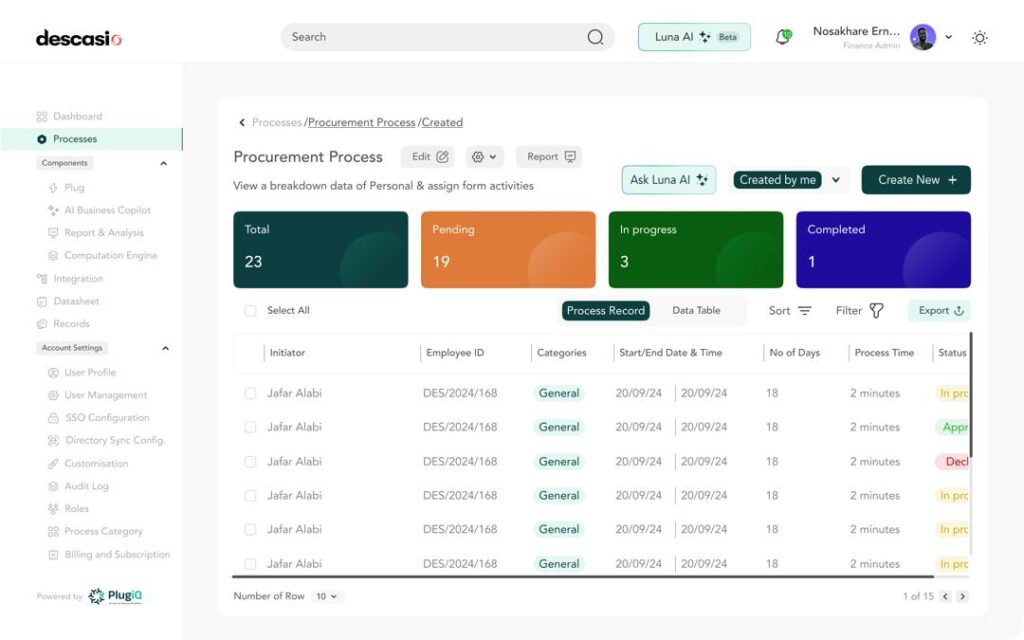 Connect ERPs, CRMs, HRMS, and collaboration tools for seamless data flow. Roll out to teams with governance, escalations, and analytics. Iterate quickly; expand templates and copilots as Plug 2.0 and LunaAI mature to deepen enterprise adoption.